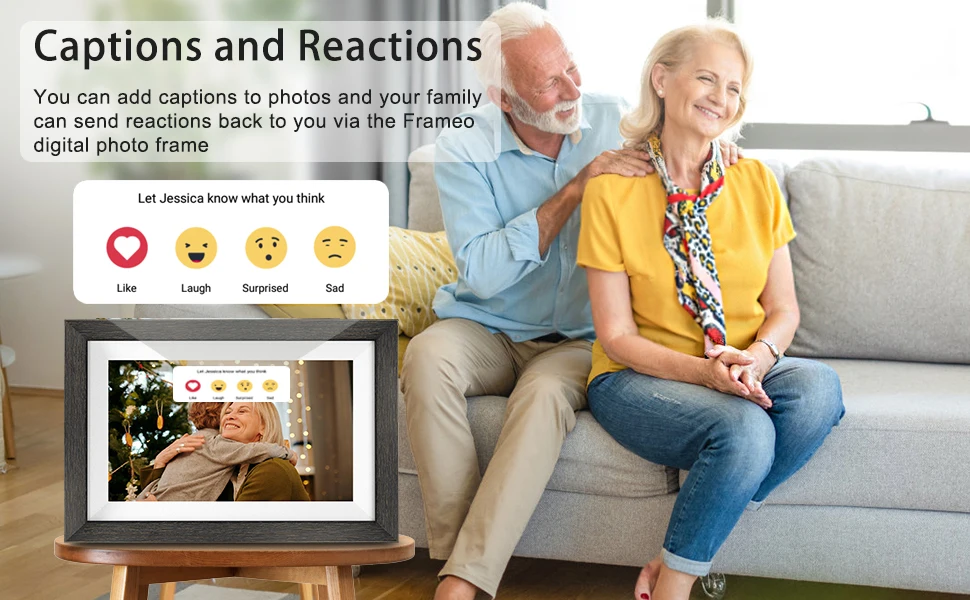 You can add captions to photos and your familycan send reactions back to you via the Frameodigital photo frame