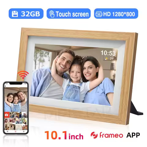The wooden frame design is fashionable and textured.10.1 in digital picture frame is featured with 800*1280 Resolution IPS touch screen which allows you to get a nice visual from any angle.Built-in 32GB memory empowers a huge capability of storage of over 80,000 photos on the digital photo frame. Supports uploading pictures in batches with the micro SD card (max 64GB) provide you more options for file storage and management