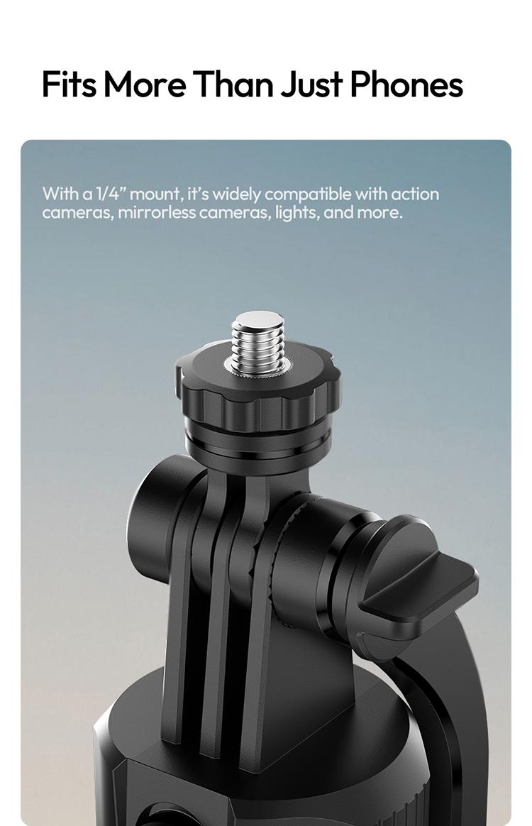 Connects to cameras, GoPro, and ring lights via a standard 1/4-inch screw interface. The adjustable phone holder fits iPhone 17/16/15/14/13/12 series and most Android devices. Ideal for multi-device shooting. Enjoy seamless use with various devices.